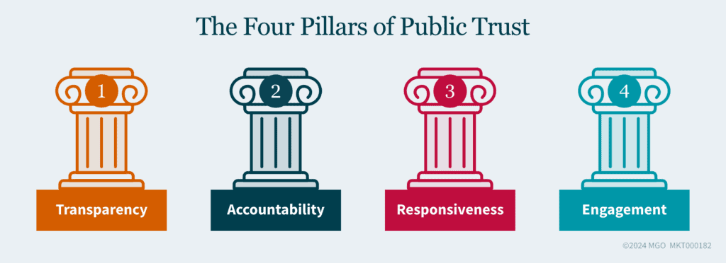 • Trust-building strategies, such as open meetings, diverse boards, and regular audits, foster stronger connections with constituents and protect public resources.