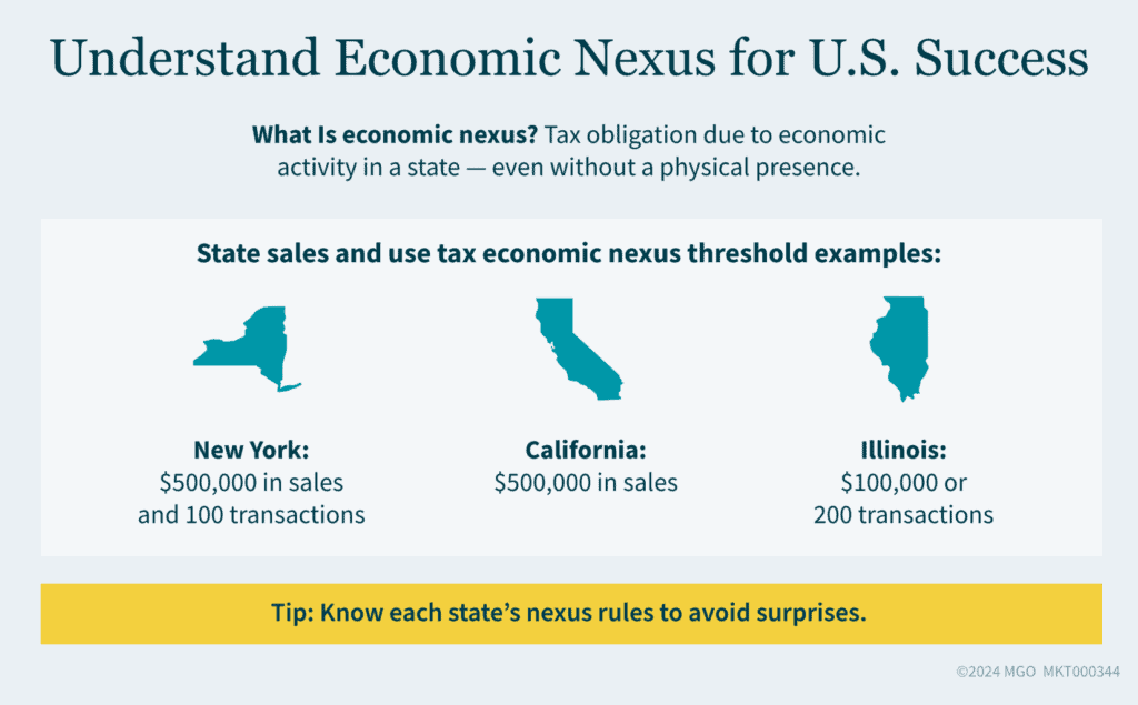 - Understand economic nexus to avoid unexpected tax liabilities when expanding your business into the United States.