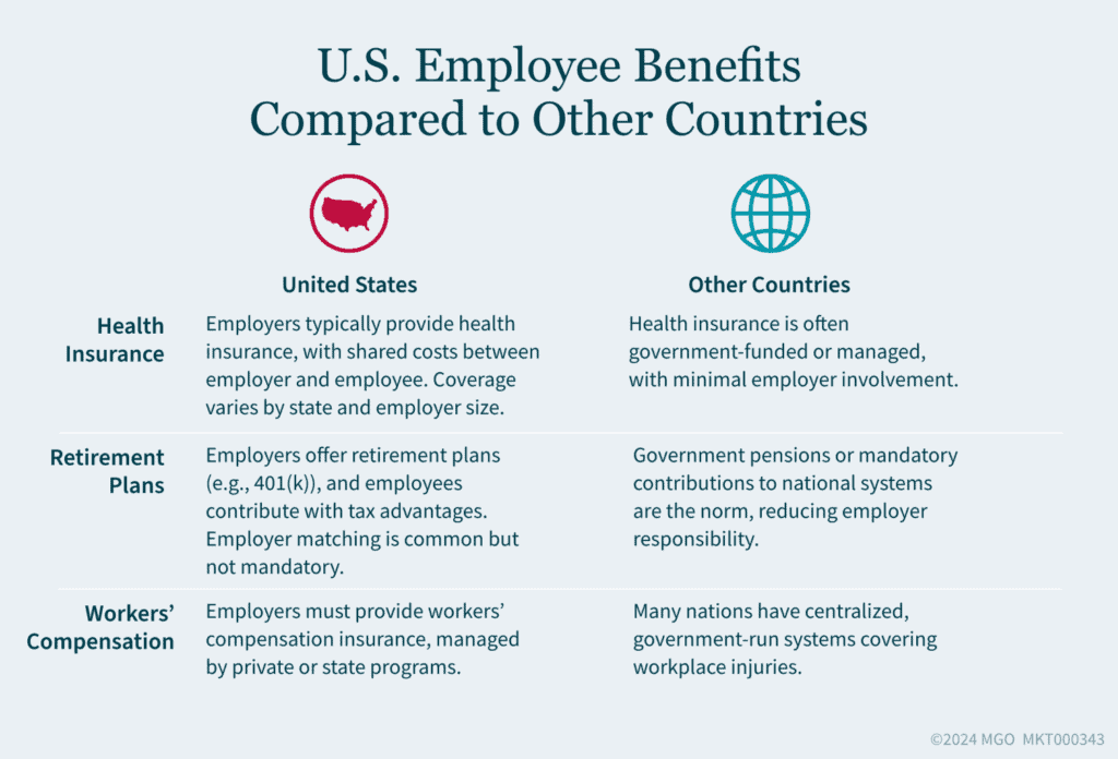- Differences in Employee Benefits Between the U.S. and Other Countries: In many countries, such as those in the European Union, employee benefits like health insurance and retirement plans are often managed or mandated by the government. However, in the U.S., these benefits are typically the responsibility of the employer. This shift can be surprising for foreign companies, requiring a thorough understanding of U.S. labor laws and regulations.