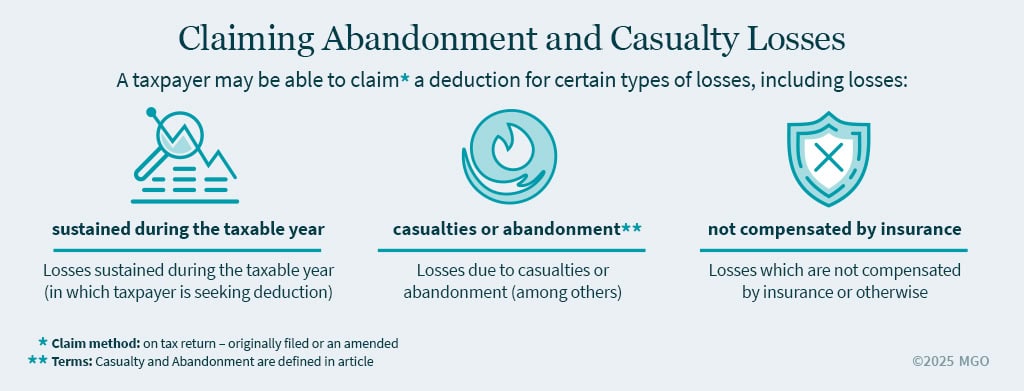 A taxpayer may be able to claim a deduction for certain types of losses it sustains during a taxable year — including losses due to casualties or abandonment, among others — that are not compensated by insurance or otherwise.