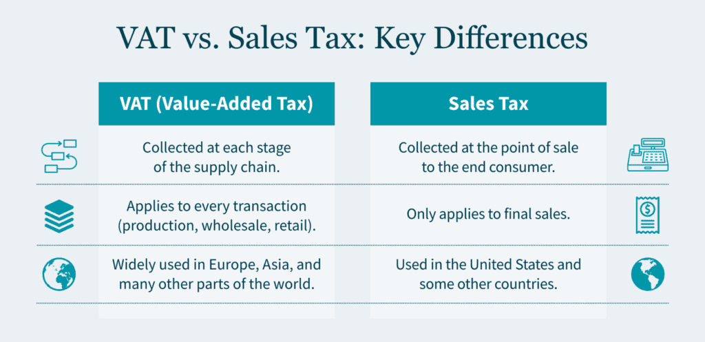 While VAT is a tax applied at each stage of the supply chain based on the added value, U.S. sales tax is typically collected only at the ultimate point of sale to the end consumer. This distinction can influence pricing strategies, cash flow management, and overall tax planning for your business.