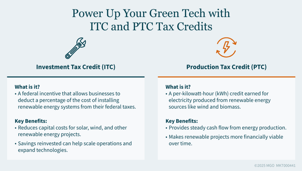 To help your company unlock the full potential of these opportunities, here’s a closer look at key tax incentives available to green tech businesses — and how they can drive both immediate and long-term value.