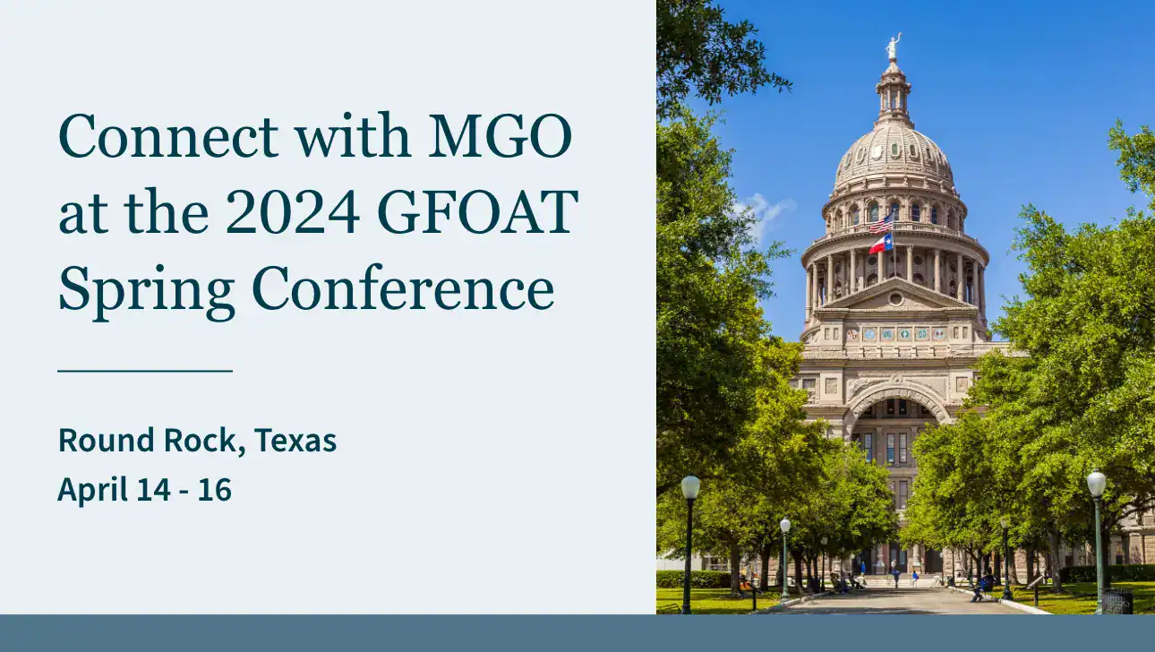 Our State and Local Government team will be attending the 2024 Government Finance Officers Association of Texas (GFOAT) Spring Conference from April 14-16 at Kalahari Resorts and Conventions in Round Rock, Texas.