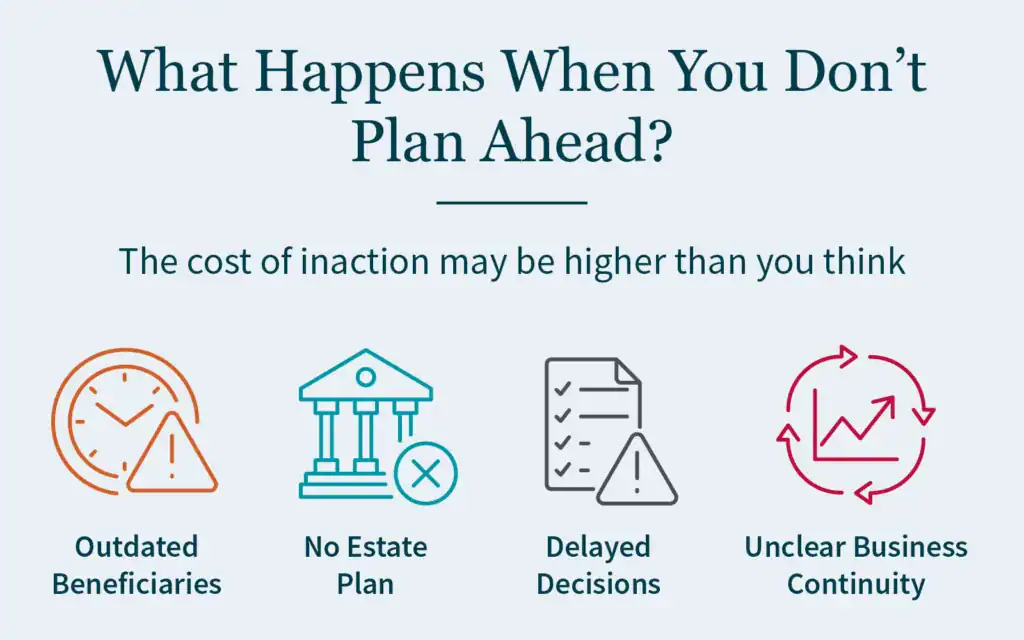 Graphic showing some of the risks of not prioritizing planning, including outdated beneficiaries, delayed decisions, and unclear business continuity