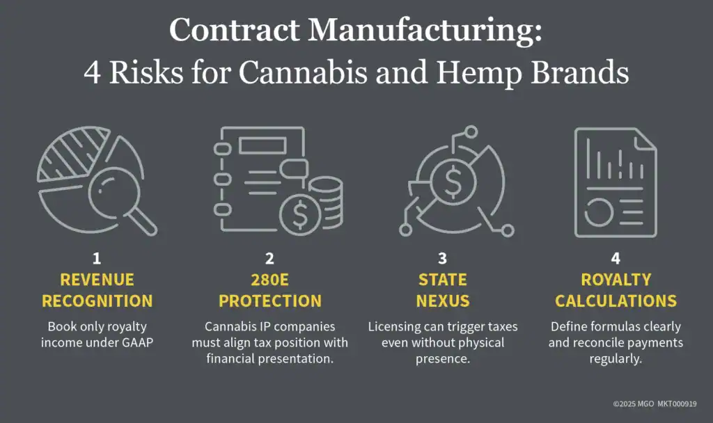 Contract manufacturing can offer compelling growth opportunities for your cannabis or hemp brand. The key to sustainable success lies in disciplined revenue presentation, strong tax positioning, proactive compliance, and robust royalty oversight.