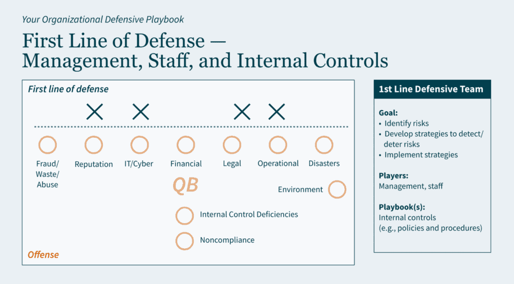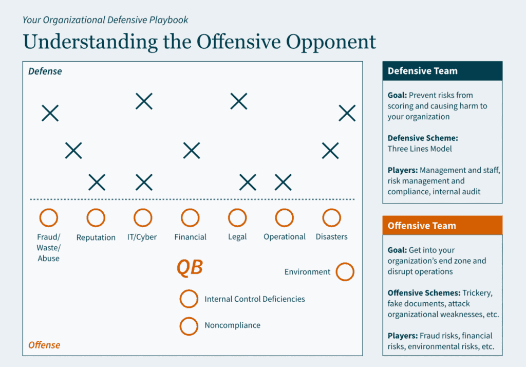 Let’s say that risk is the offensive team. Its goal is to get into your organization’s end zone to disrupt operations. The quarterback could be a hacker, fraudster, or unintentional human error. The offensive team also has other formidable players: fraud risks, cyber-attack risks, liquidity risks, etc.