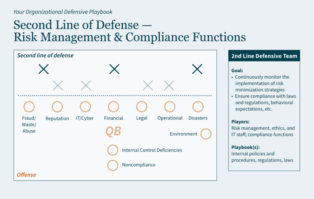 Second line of defense diagram showing risk and compliance teams protecting against organizational threats