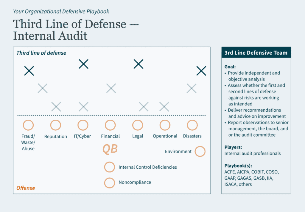 Internal audit assists with ensuring your organizational playbook(s) remain relevant. As the third or last line of defense, it analyzes the entire field (the organization) to make sure your defensive strategies (internal controls) are effective at averting risks from scoring (causing financial, operational, reputational, etc., losses).