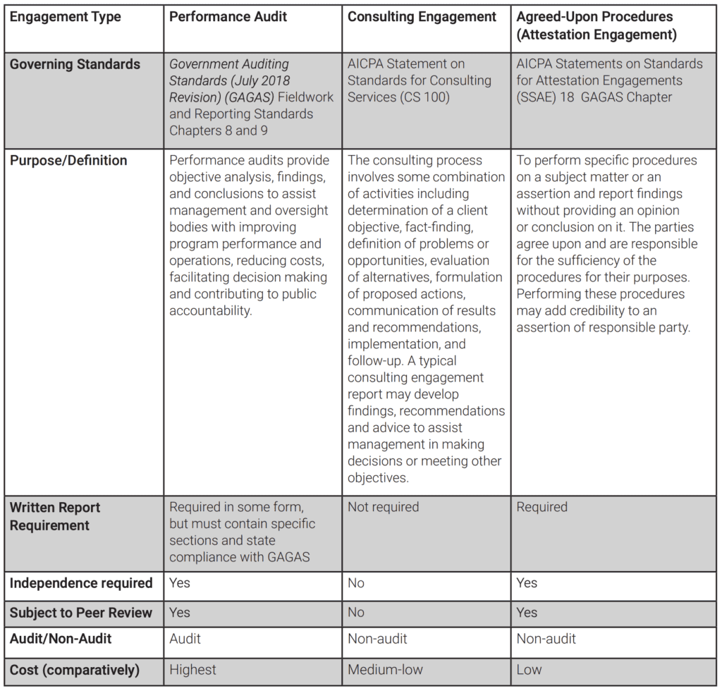 It is important to identify the differences between (1) performance audits, (2) consulting services engagements, and (3) agreed-upon procedures attestation engagements. On numerous occasions throughout my government service career and also while serving clients, questions have come up regarding the objectives sought, the scope of the engagement, and the engagement type when considering an evaluation of performance for a particular program or area of operations. Each of these engagements differ in purpose and reporting requirements, as well as potential cost, as shown below in Figure 1.0. These engagements are governed by different standards, formal reports are not always required for each, and independence is not always required (i.e., consulting services).