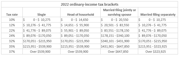 Tax-bracket thresholds increase for each filing status but, because they’re based on percentages, they increase more significantly for the higher brackets. For example, the top of the 10% bracket increases by $325 to $650, depending on filing status, but the top of the 35% bracket increases by $16,300 to $19,550, again depending on filing status.