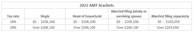 Like the regular tax brackets, the AMT brackets are annually indexed for inflation. For 2022, the threshold for the 28% bracket increased by $6,200 for all filing statuses except married filing separately, which increased by half that amount.