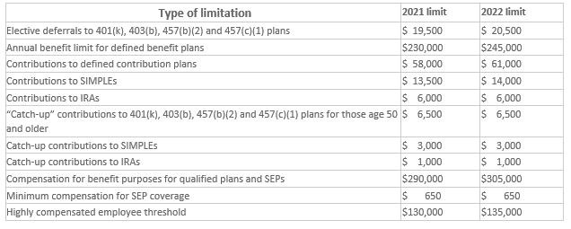 Not all of the retirement-plan-related limits increase for 2022. Thus, depending on the type of plan you have, you may have limited opportunities to increase your retirement savings if you’ve already been contributing the maximum amount allowed.