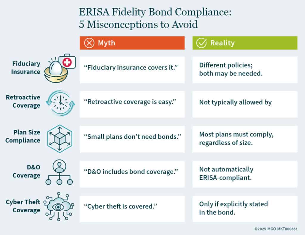 Infographic comparing ERISA fidelity bond myths versus realities with five common compliance misconceptions.