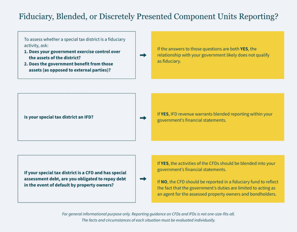 To assess whether a special tax district like a CFD or IFD is a fiduciary activity for reporting purposes, ask these questions: