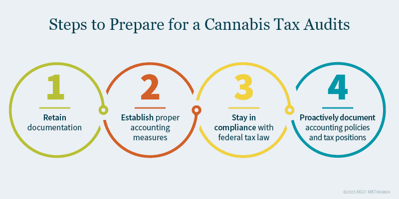 - Prepare for a cannabis tax audit by retaining 10 years of thorough financial records, using GAAP-compliant accounting methods, and staying current on all federal tax obligations.