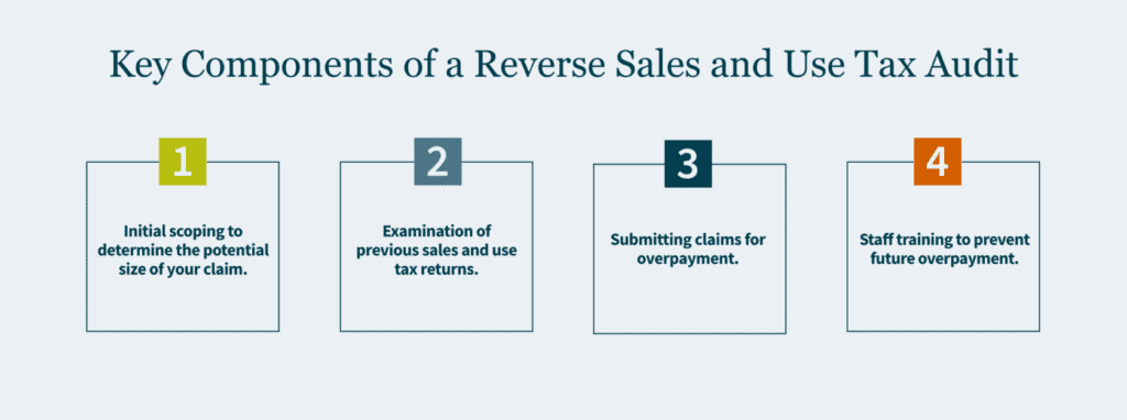 Infographic showing four key components of a reverse sales and use tax audit from scoping to staff training.