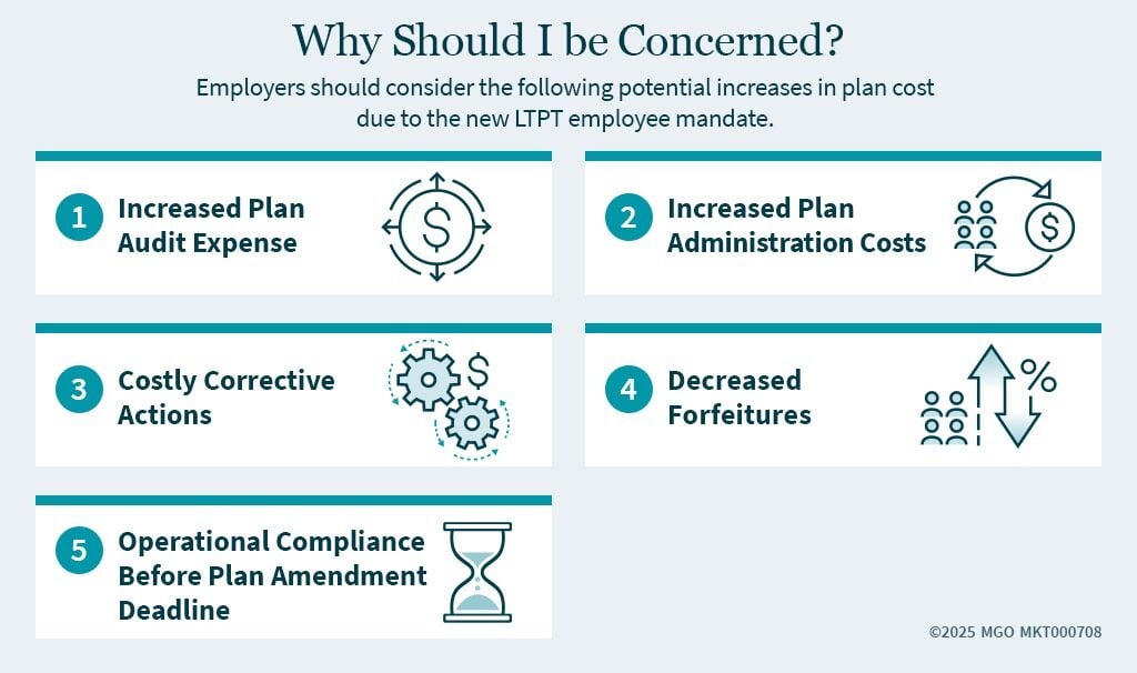 Some executives may view this change as an issue that does not require their attention and that will be handled by their human resources (HR) staff and the 401(k) plan service providers. But not complying with the rules might be costly for the employer if corrective contributions for LTPT employees who were not allowed to participate are required, along with ancillary costs.