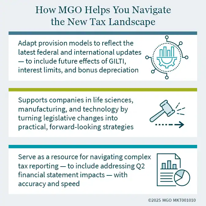 The OBBBA brings a wave of corporate tax changes that present both risk and opportunity, especially around deferred tax assets, valuation allowances, and interim reporting under ASC 740. MGO’s Tax team works with tax and finance leaders to adapt provision models to reflect the latest federal and international updates. We support companies in life sciences, manufacturing, and technology by turning legislative changes into practical, forward-looking strategies. From addressing Q2 financial statement impacts to modeling future effects of GILTI, interest limits, and bonus depreciation, we serve as a resource for navigating complex tax reporting with accuracy and speed. Contact us to learn more.