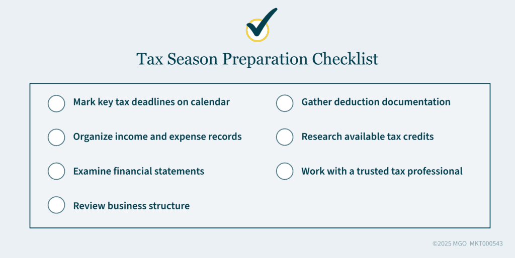 Tax season doesn’t have to be overwhelming. At MGO, we help businesses like yours stay organized, identify opportunities, and simplify tax season. Whether you need help reviewing your financials, claiming deductions, or navigating tax credits, we’re here to make the process easier.