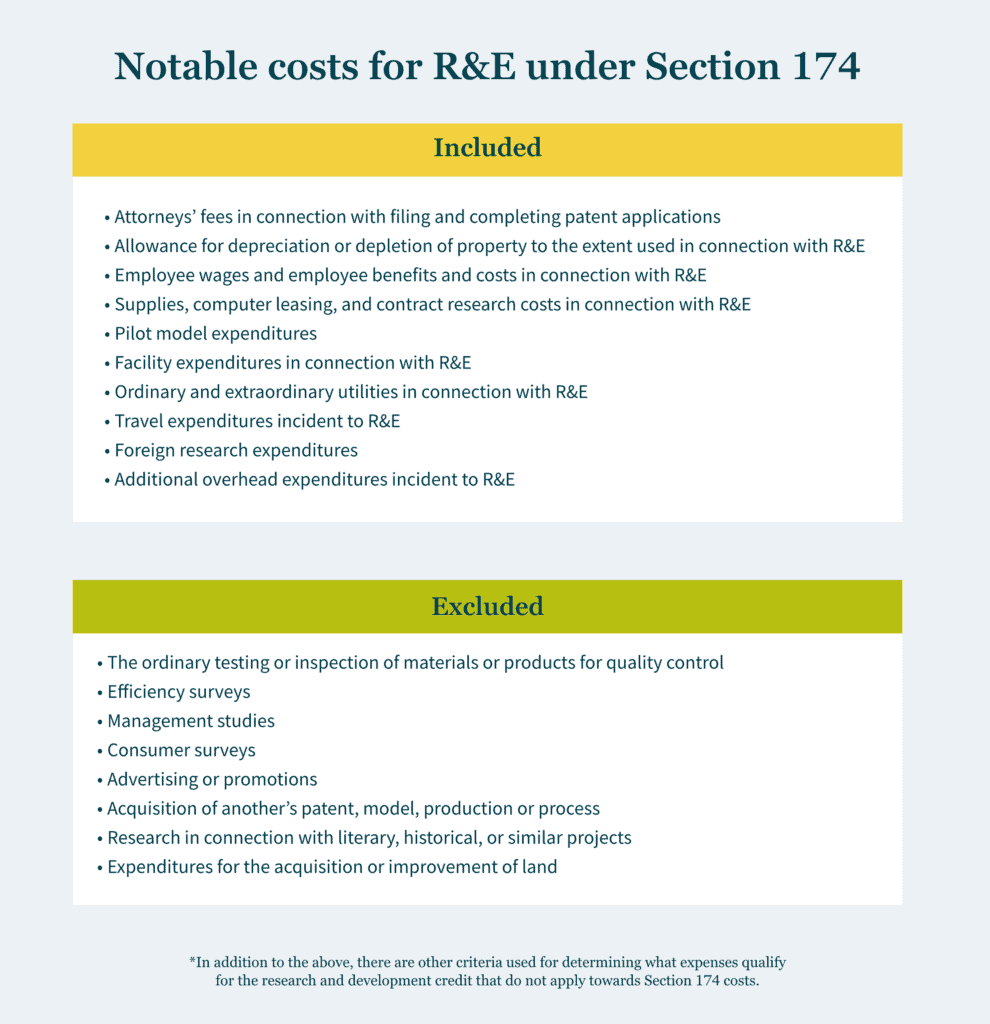 *In addition to the above, there are other criteria used for determining what expenses qualify for the R&D credit that do not apply towards determining Section 174 costs.