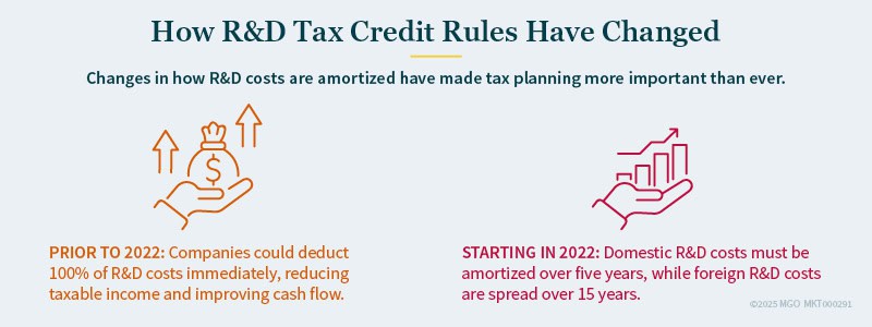 - Recent tax law changes require R&D expenses to be amortized, making careful documentation and tax planning essential.
