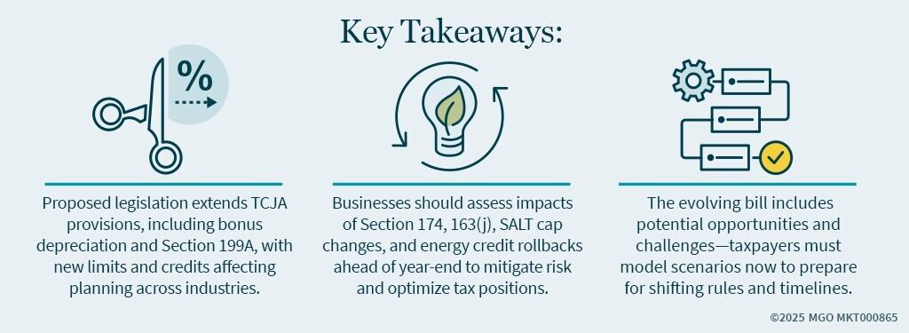 As the legislative landscape shifts, MGO supports businesses and investors navigating complex tax reform developments. Our team closely monitors proposed changes, like the extended TCJA provisions, Section 174 amortization, 163(j) interest limitations, and SALT cap negotiations, to make sure you’re informed and prepared. Whether you’re evaluating bonus depreciation, energy credits, or pass-through deduction adjustments, our team can help you with your tax position, mitigate any surprises, and plan with confidence. We combine technical knowledge with practical tools to guide your decision-making in a fast-changing environment. Learn more at mgocpa.com.