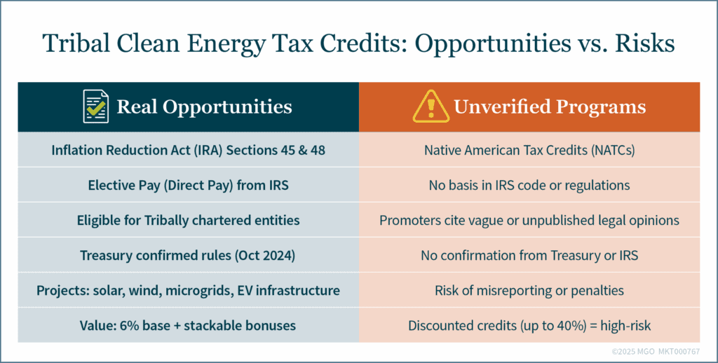Clean energy tax credits have opened a new chapter of opportunity for Tribal governments and their wholly owned business entities. Under the Inflation Reduction Act (IRA), Tribal nations can now receive federal funding through elective pay (also called direct pay), even though they are not subject to federal income tax. However, as new opportunities appear, some promoters are marketing tax credit structures that remain unsupported by current law or IRS guidance.