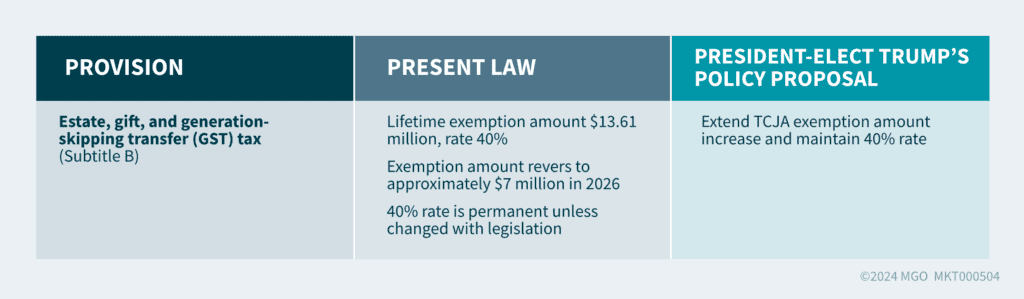 The tables below outline current tax law and policy, as well as expected potential future tax policies under a Trump administration. Four separate tables cover provisions for business tax, international tax, individual tax, and estate, gift, and generation-skipping transfer (GST) tax. All data is based on information released or discussed by Trump as of November 8, 2024.