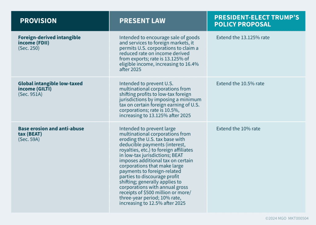 Republicans also gained control of the Senate and will have a small majority in the chamber in 2025. As of the date of publication of this article, control of the House has yet to be called. Even if Republicans retain control of the House, passing tax legislation may still be challenging. Unless the legislative filibuster is eliminated from Senate rules, any tax law changes will likely still have to be passed through the budget reconciliation process. If the Democrats manage to gain control of the House, passing tax legislation to advance Trump’s policies would become much more difficult and will require much more bipartisan negotiating.