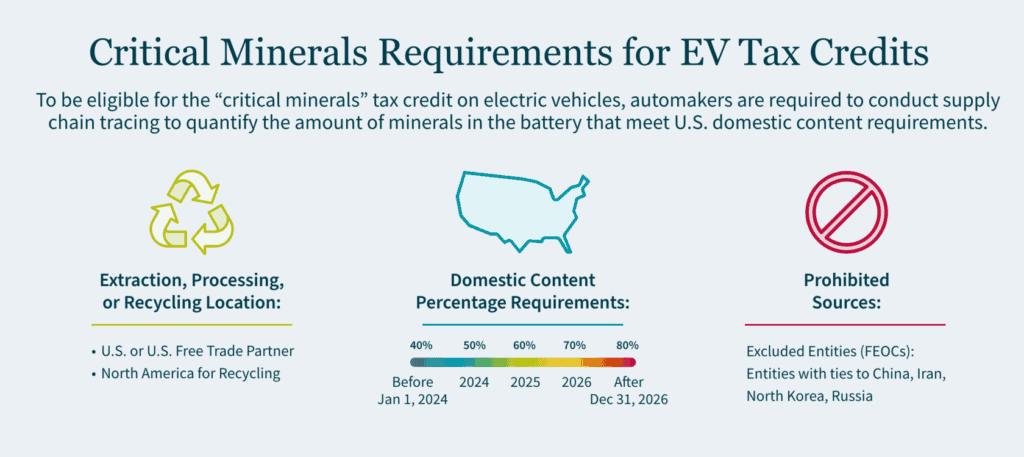- Automakers must trace battery supply chains to meet U.S. content requirements, with a $3,750 credit for using qualified critical minerals.