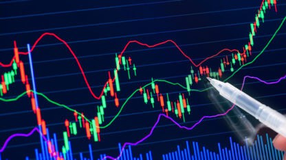 A pen pointing at a digital display of a line graph, box plot, and bar graph superimposed on one another.